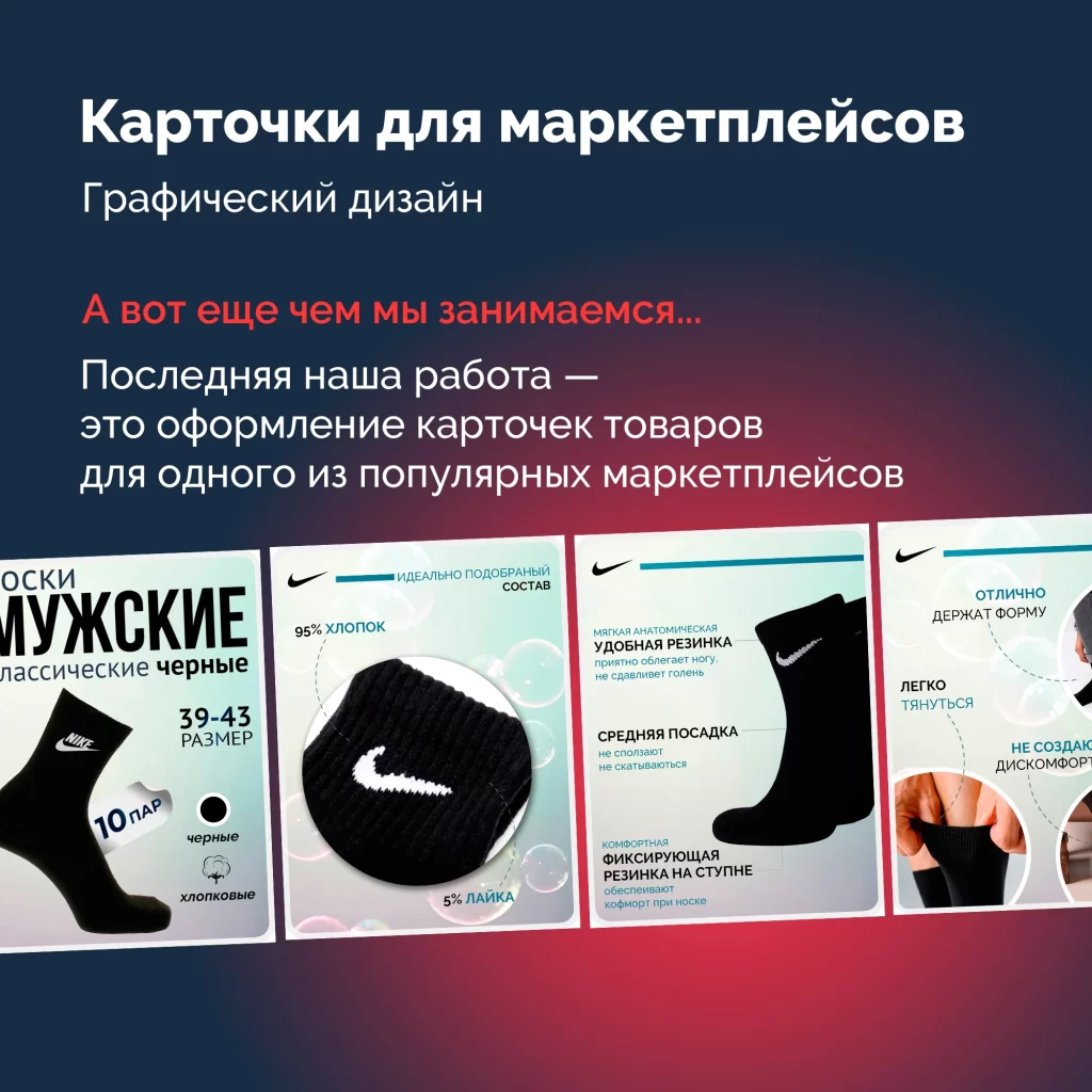 Друзья, а вот чем мы еще занимаемся — разработкой графического дизайна карточек товаров для различных маркетплейсов. Наши специалисты создают качественные и привлекательные изображения, которые помогают повысить видимость товаров и увеличить продажи.