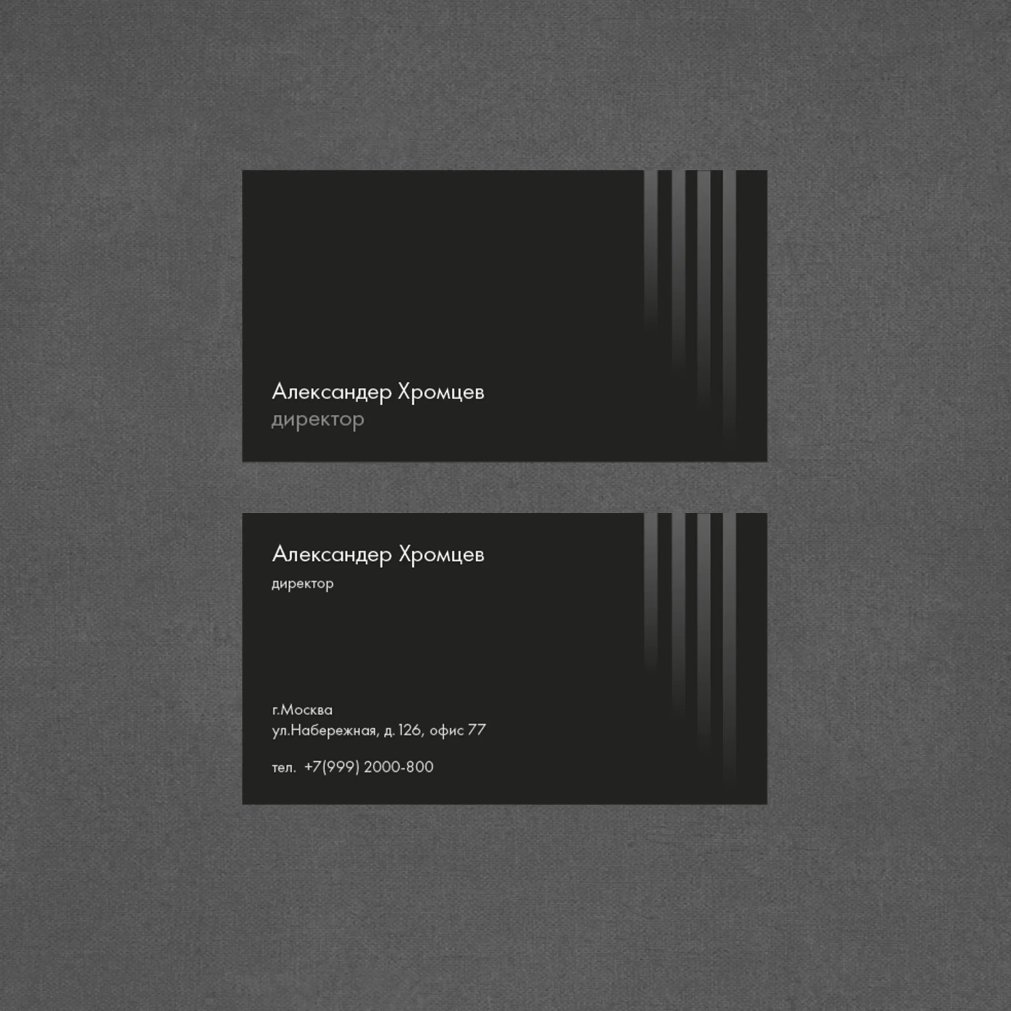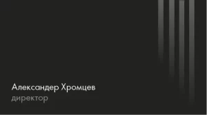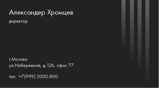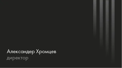 Минималистичный и современный шаблон визитки, созданный специально для руководителей и топ-менеджеров компаний. Лаконичный чёрный фон с тонкими вертикальными линиями добавляет дизайну строгости и элегантности. Имя и должность владельца визитки размещены асимметрично, что придает композиции динамичность и современность.