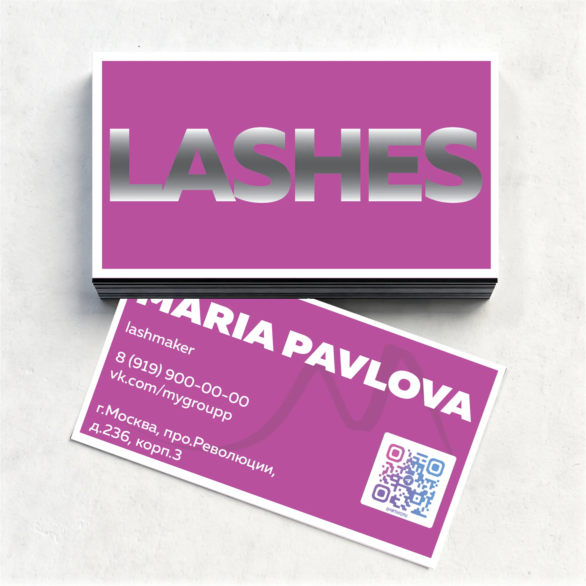 Яркая и запоминающаяся визитка для лэшмейкера с динамичным дизайном, создающим незабываемое первое впечатление. Розовый фон символизирует креативность и позитив, моментально притягивая взгляд и вызывая улыбку. Белая тонкая рамка вокруг визитки добавляет элегантности и утонченности, подчёркивая ваше чувство стиля и профессионализм. Формат файла .ai позволяет легко редактировать визитку в Adobe Illustrator, создавая уникальный дизайн, идеально подходящий именно вам. Такой образ точно привлечёт новых клиентов и подчеркнёт ваш талант и индивидуальность!